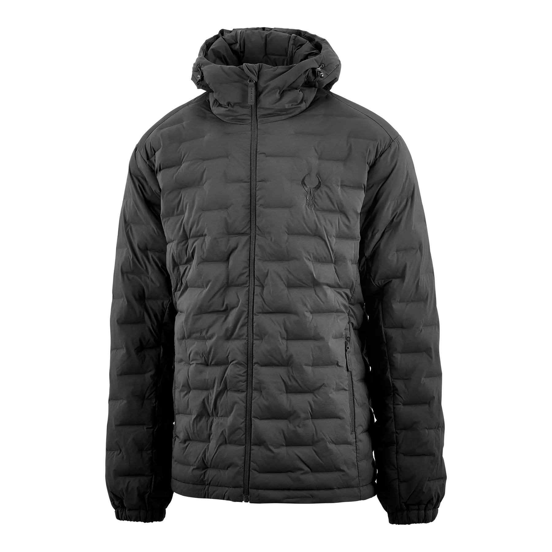 Black quilted hooded jacket with front zipper and Moonrivers skull logo on the chest.