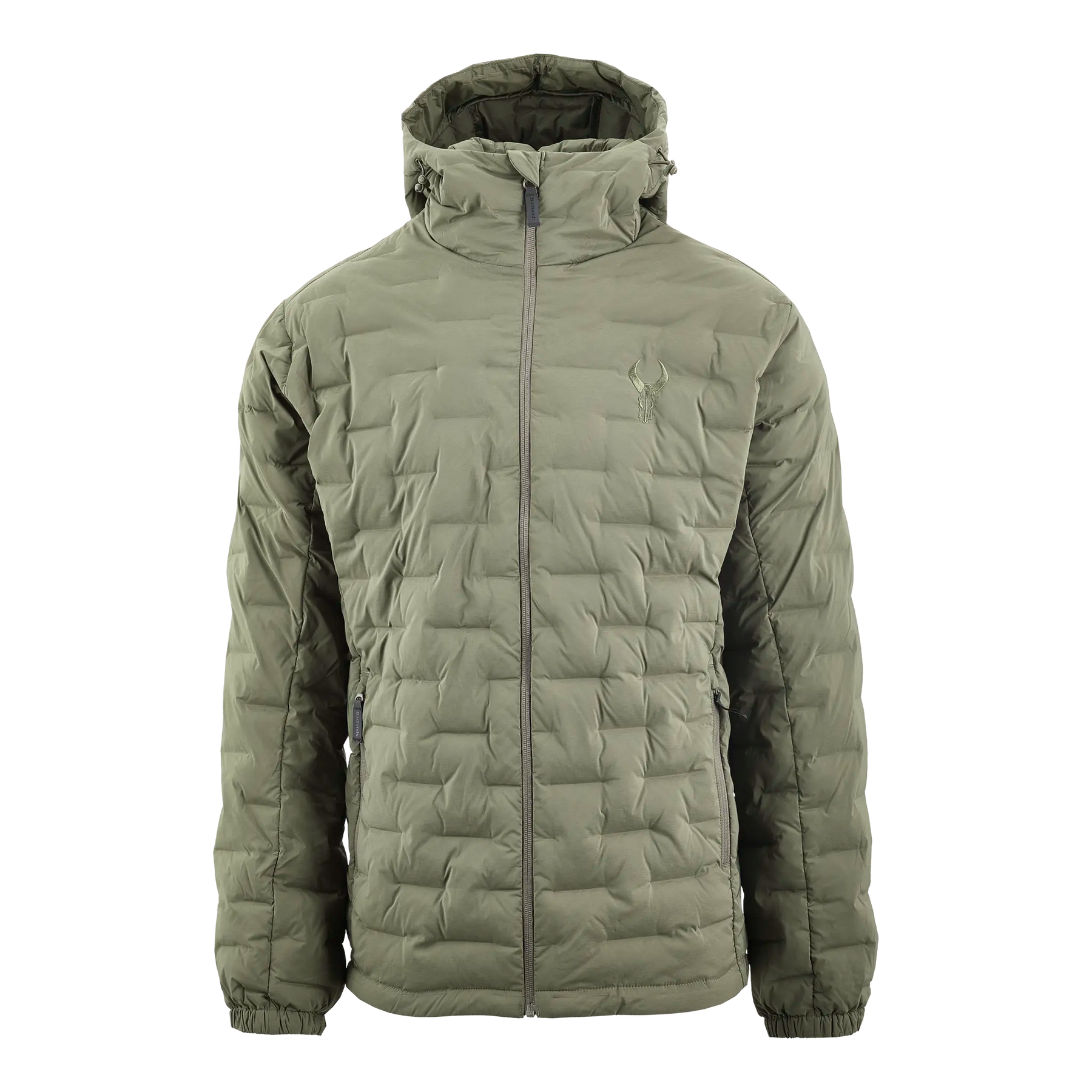 Olive green quilted jacket with hood, front zipper, and Moonrivers skull logo on the left chest.