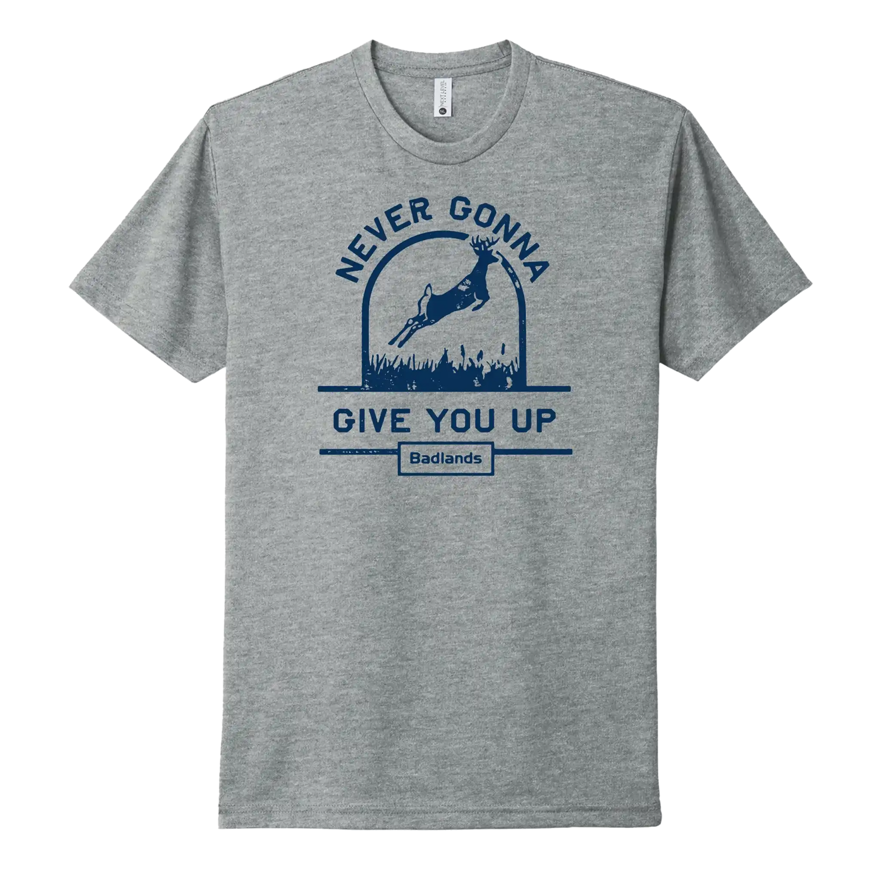 Gray t-shirt with a leaping deer, text "Never Gonna Give You Up," and the Moonrivers Logo below. Blue graphic and lettering.